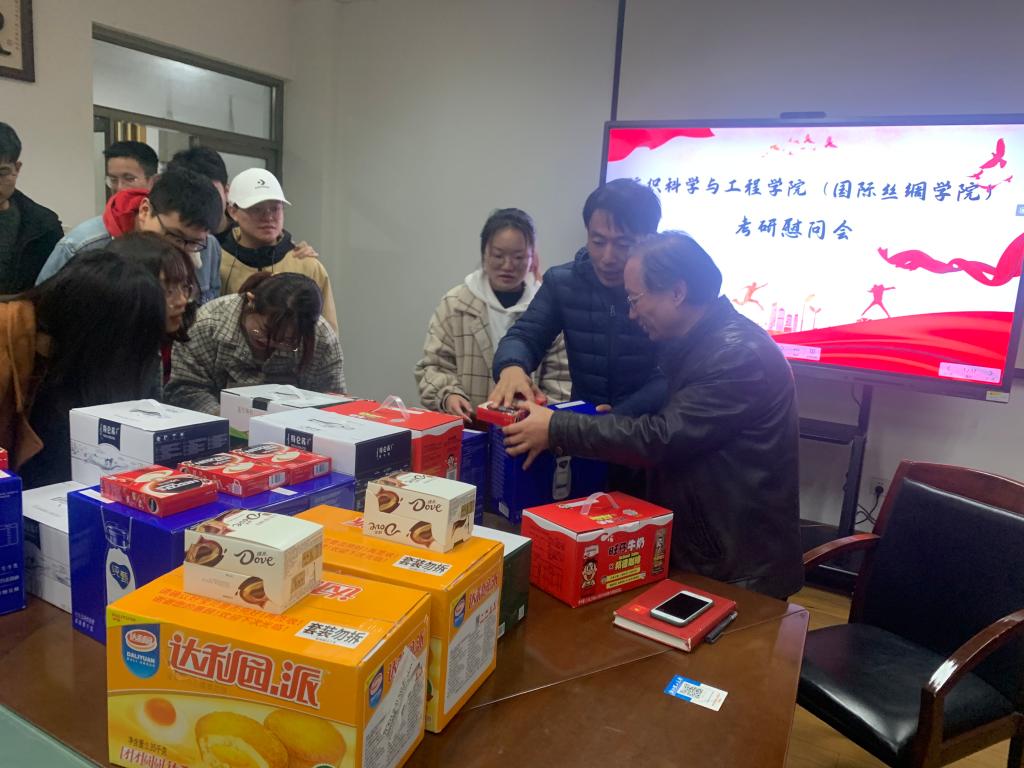 白昼渐短,寒夜愈长,2021年全国硕士研究生招生考试已进入到最后的倒计时,考研学子依旧在为了心中的那份坚持而努力。为了鼓励考研同学积极迎考、舒缓备考压力,完成这场“马拉松”比赛,纺织科学与工程公司(国际丝绸公司)的老师们为考研学子采购了牛奶、巧克力和一些小点心,希望为同学们带来冬日的温暖。