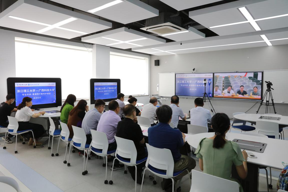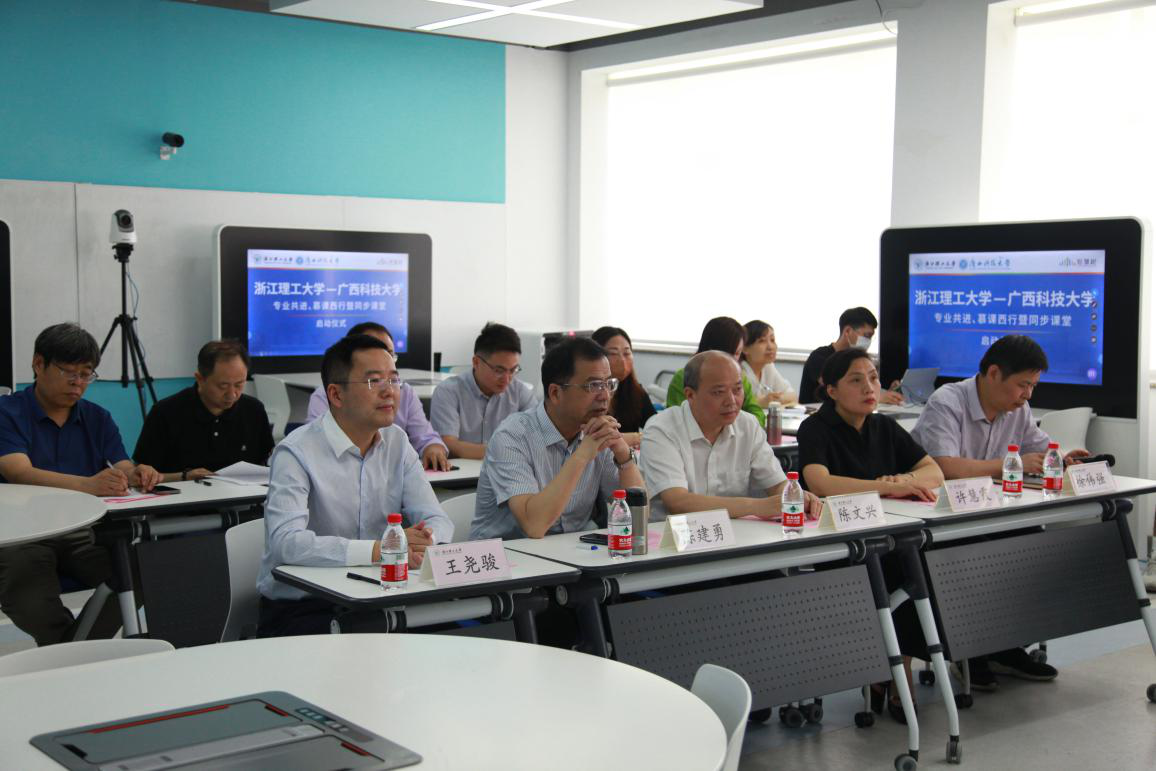 6月7日上午,在校智慧教室,MK体育和广西科技大学师生齐聚云端,开展“专业共进、慕课西行暨同步课堂活动”启动仪式,同时在公司大力支持下,浙江省现代纺织专业建设虚拟教研室现场启动并开展了同步课堂教学活动。董事长陈文兴,副董事长许慧霞,原副董事长陈建勇,MK体育、材料科学与工程公司、国际教育公司等有关领导和老师;广西科技大学副董事长秦小云,教务处处长秦福利,生物与化学工程公司、天虹现代纺织产业公司等有关领导和老师出席了启动仪式。启动仪式由教务处处长王尧骏主持。