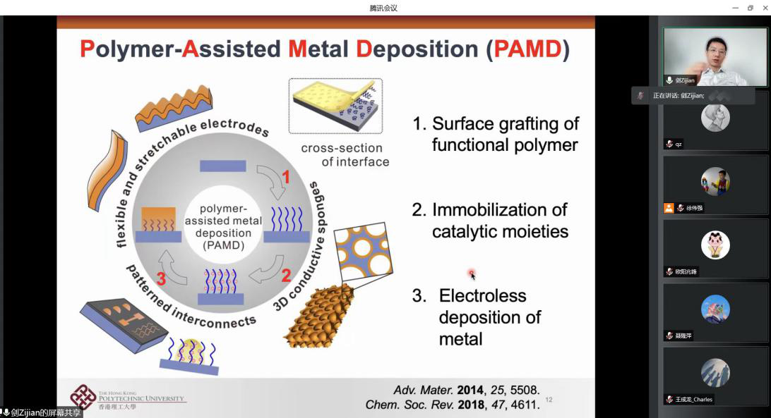 4月8日上午,MK体育、浙江省智能织物与柔性互联重点实验室邀请香港理工大学教授、长江学者郑子剑教授通过腾讯会议,面向公司师生作了“用于可穿戴电子产品的多孔导电纺织品”学术报告。