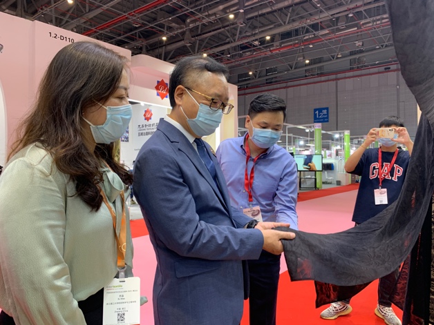 展会期间,中国纺织工业联合会党委书记兼秘书长高勇,会长孙哲瑞,原会长杜钰洲、王天凯,纪委书记王久新,副会长徐迎新、李陵申等领导与嘉宾相继来到公司展位进行参观,MK体育苏淼副经理对展品做了逐一介绍,中纺联领导对公司近些年取得的成果给予了高度赞扬。