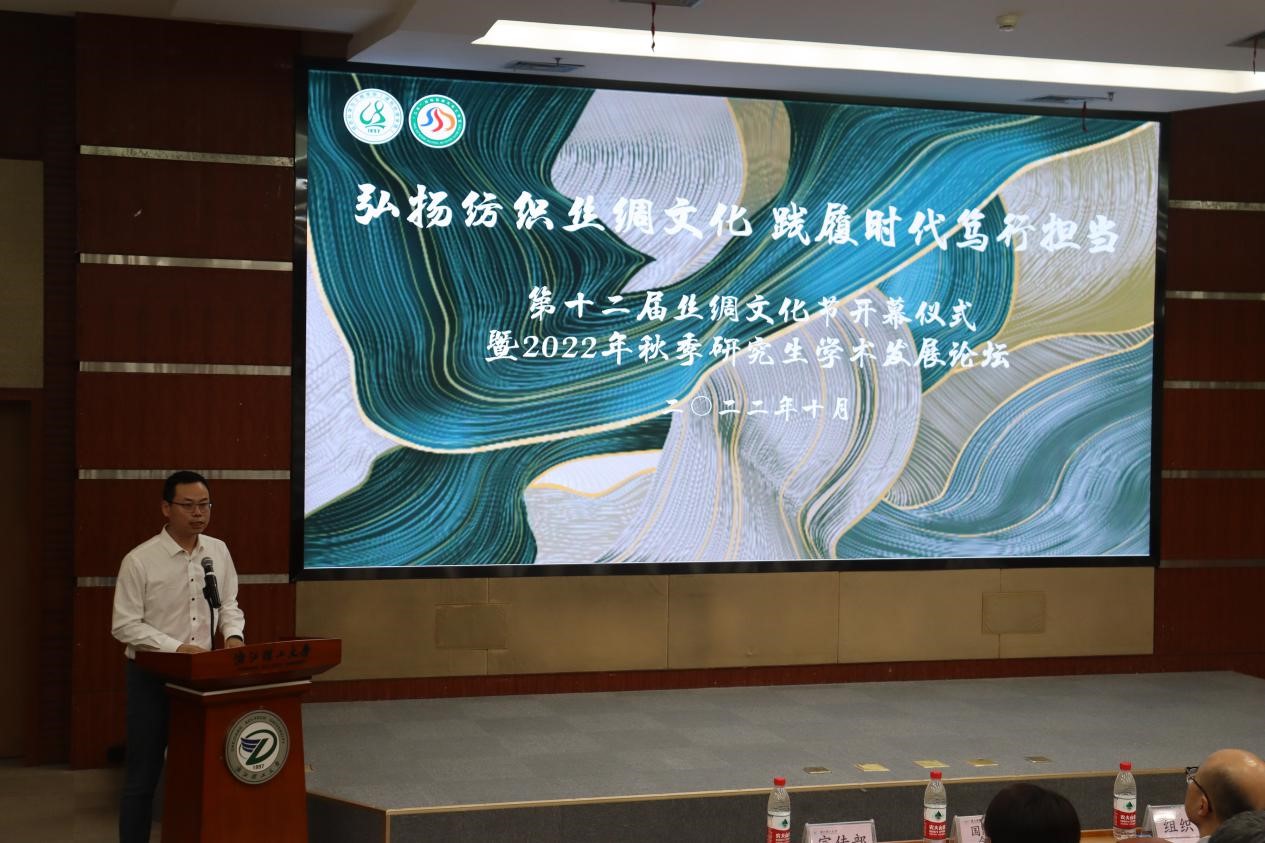 纺织(丝绸)公司党委书记徐伟强致辞,他说,公司和公司在打造丝绸文化方面进行了长期的探索与实践,并指出丝绸文化节蕴含着文化自信、文化自强的浓厚气息,是校园文化育人、红色文化育人、丝绸文化育人的鲜明指向,希望广大同学能投身到纺织丝绸教育中,努力成长为富有实干精神、具有民族气节、自强自信的时代青年。