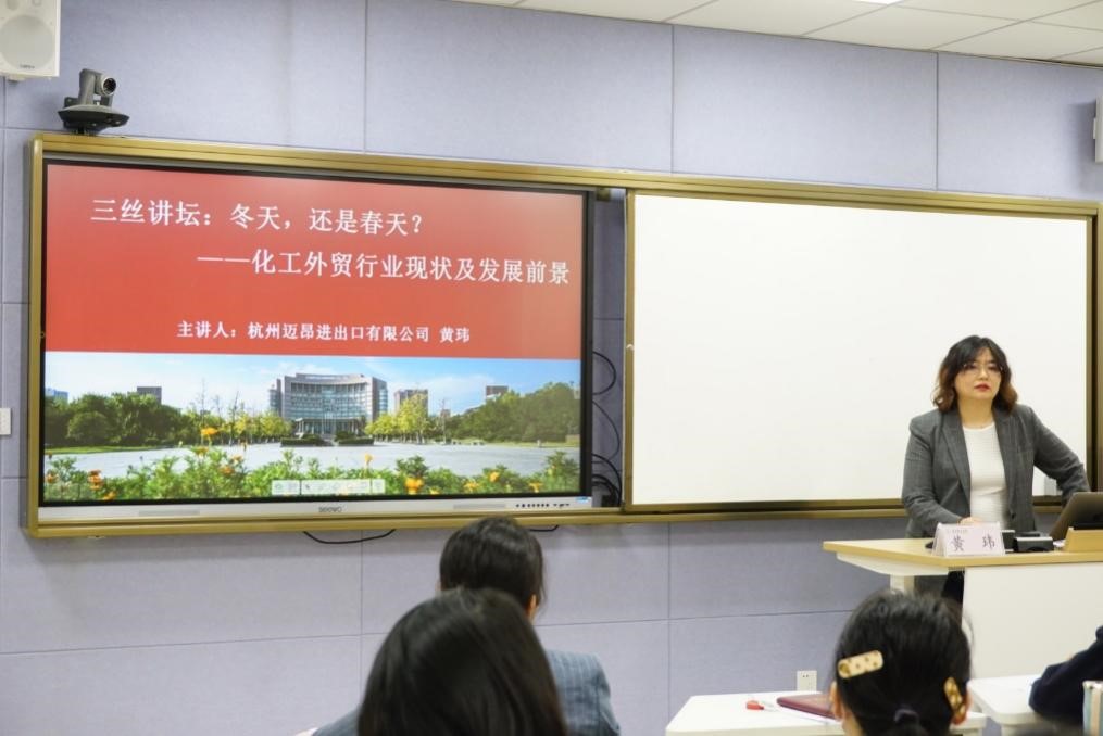 捐赠仪式后,“三丝讲坛”邀请迈昂公司副总经理黄玮在17号楼609智慧教室为同学们开讲《冬天,还是春天?——化工外贸行业现状及发展前景》。黄玮从目前趋势、面临挑战以及应对发展三个方面为同学们介绍了化工外贸行业的现实境遇,为同学们树立未来发展信心,现场反应热烈。