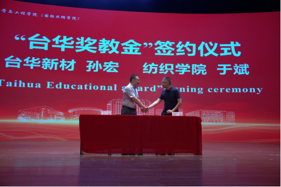 于斌经理与浙江台华新材料股份有限公司总裁助理孙宏进行“台华奖教金”签约。