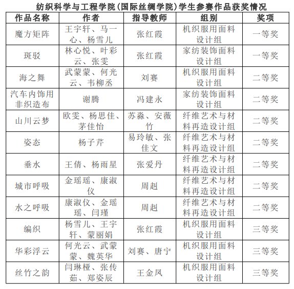 本届大赛,在各高校的积极参与和认真组织下,收到了来自全国48所纺织服装院校和1所国外院校提交的1714多项参赛作品。在上述六个组别中,评选出了559件获奖作品,其中特等奖1项,一等奖59项,二等奖169项,三等奖330项。大赛作品充分展示了中国纺织类高校人才培养教学成果和纺织类高校老员工的创新灵感和设计能力。