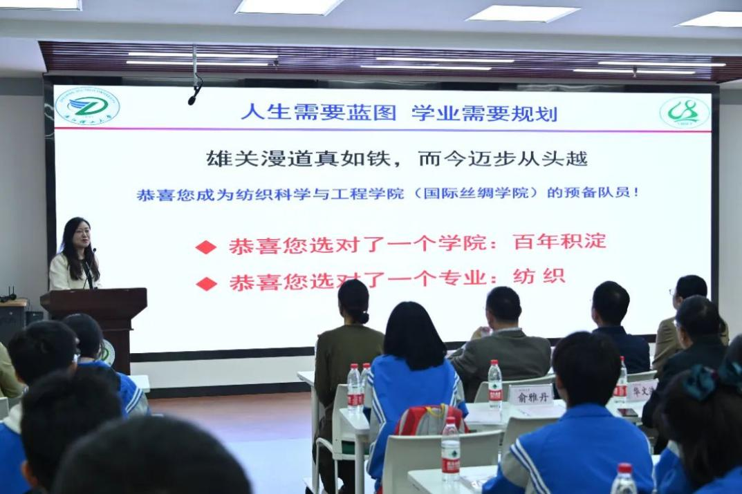 苏淼副经理向在座同学做了学业指导。她深入浅出地介绍了纺织专业的高科技发展和贴近民生的行业领域,既是国之重器也是民之所依。同时列举了纺织学科专业建设、人才培养、国际交流等工作取得的优秀成绩。寄语在座各位同学“有志者事竟成”。