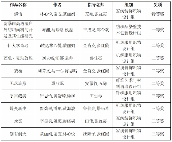 参赛作品包含“机织服用织物设计组”、“针织服用织物设计组”、“家纺装饰织物设计组”、“纺织品染整技术创新设计组”、“纤维艺术与材料再造设计组”、“户外休闲与工装服装设计组”6大领域。