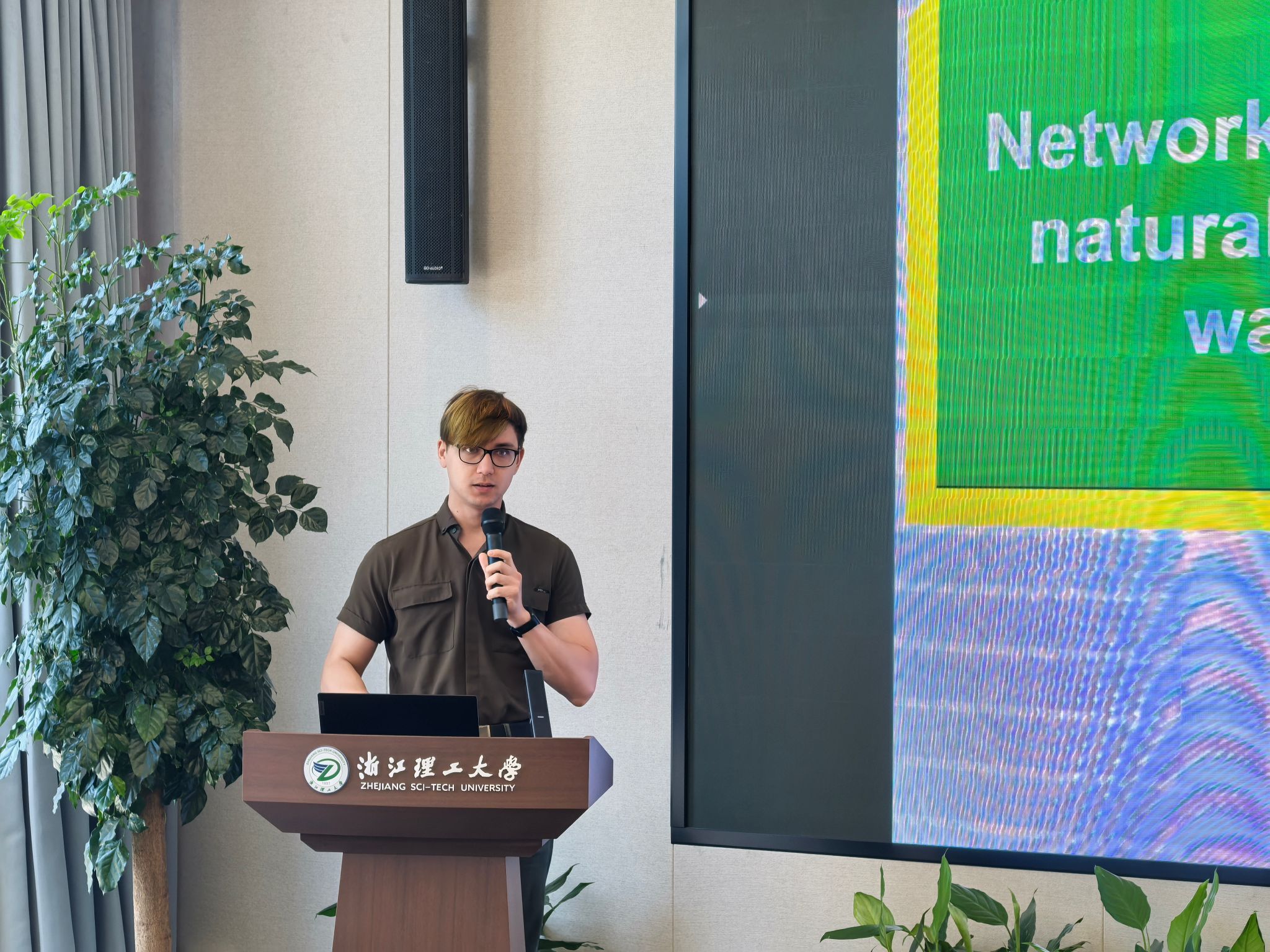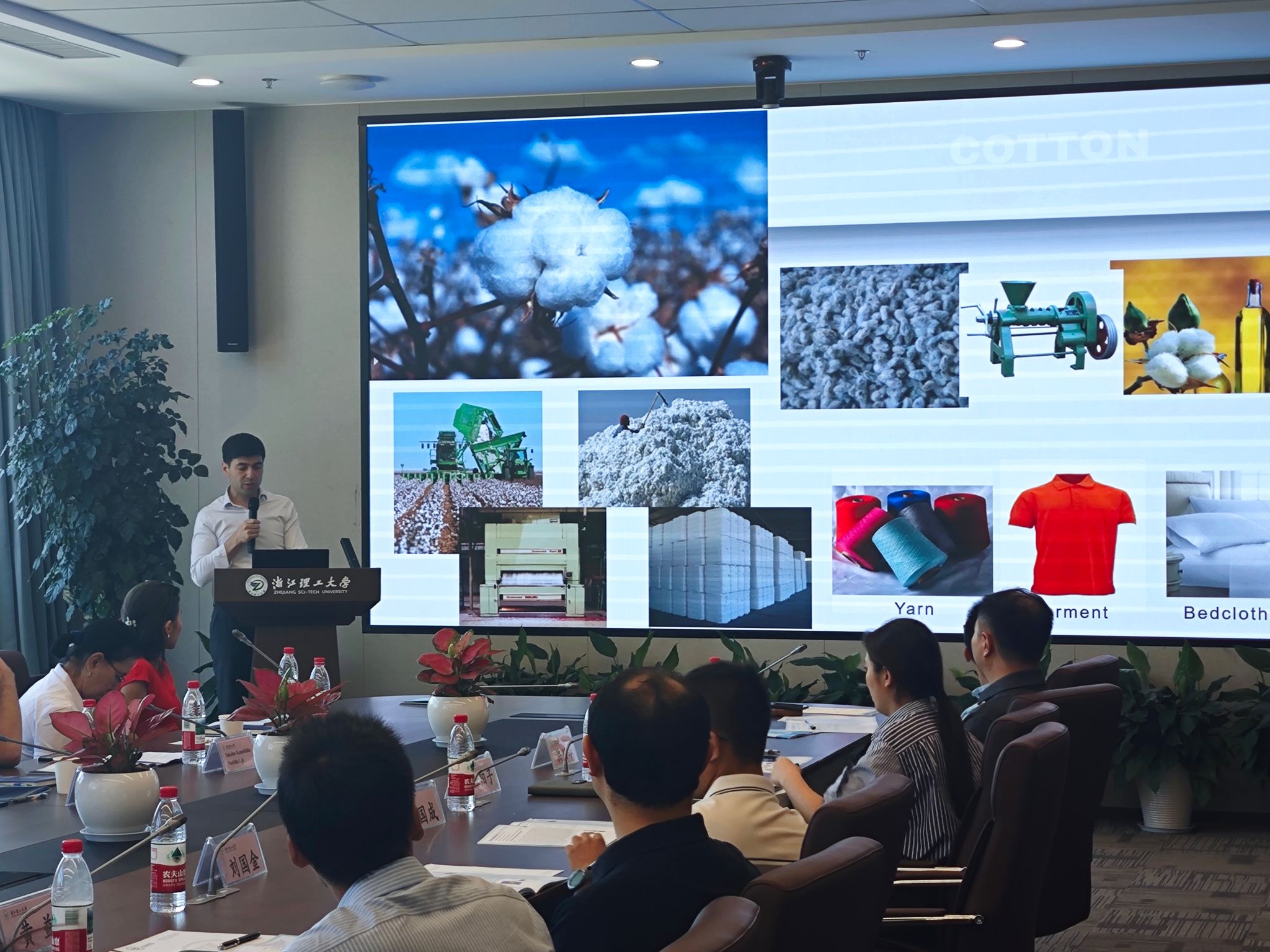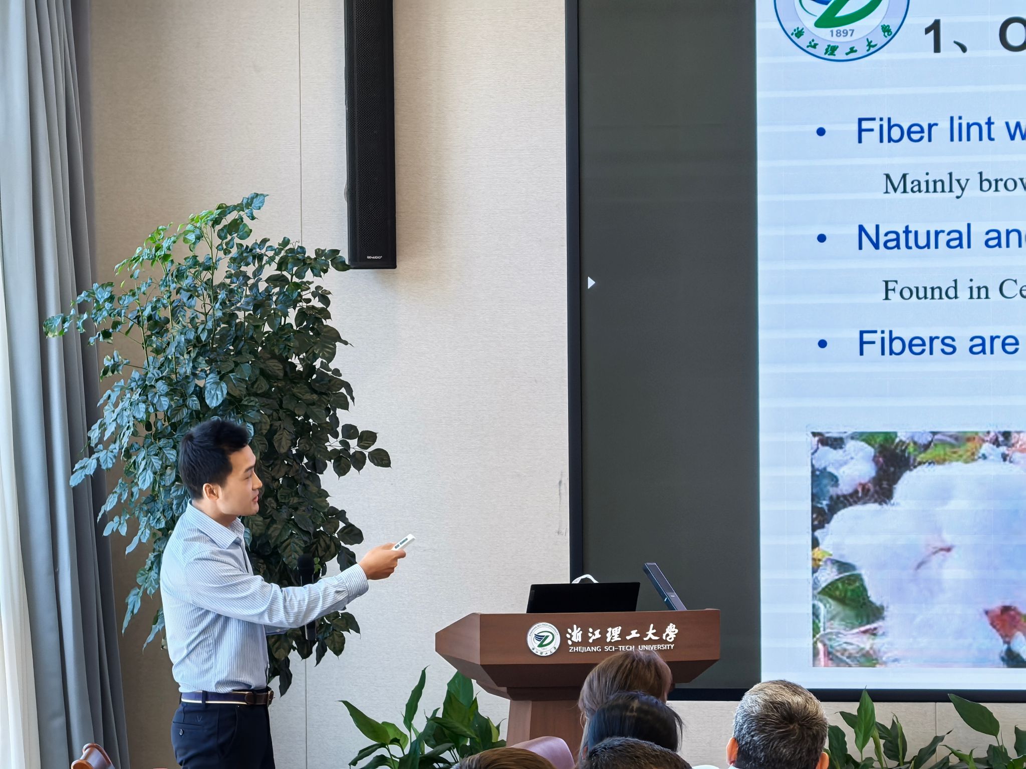 会议报告环节,来自中国、乌兹别克斯坦、巴基斯坦及俄罗斯等国的参会学者围绕“多功能电子纺织品”、“天然彩色棉的性能及湿加工”、“网络聚阴离子粘合剂”、“绿色包装材料”、“结构色材料设计”、“轧棉机技术改进”及“护理纺织品设计”等主题作了精彩报告。期间,参会学者对公司研究生学术墙报进行了参观、点评。