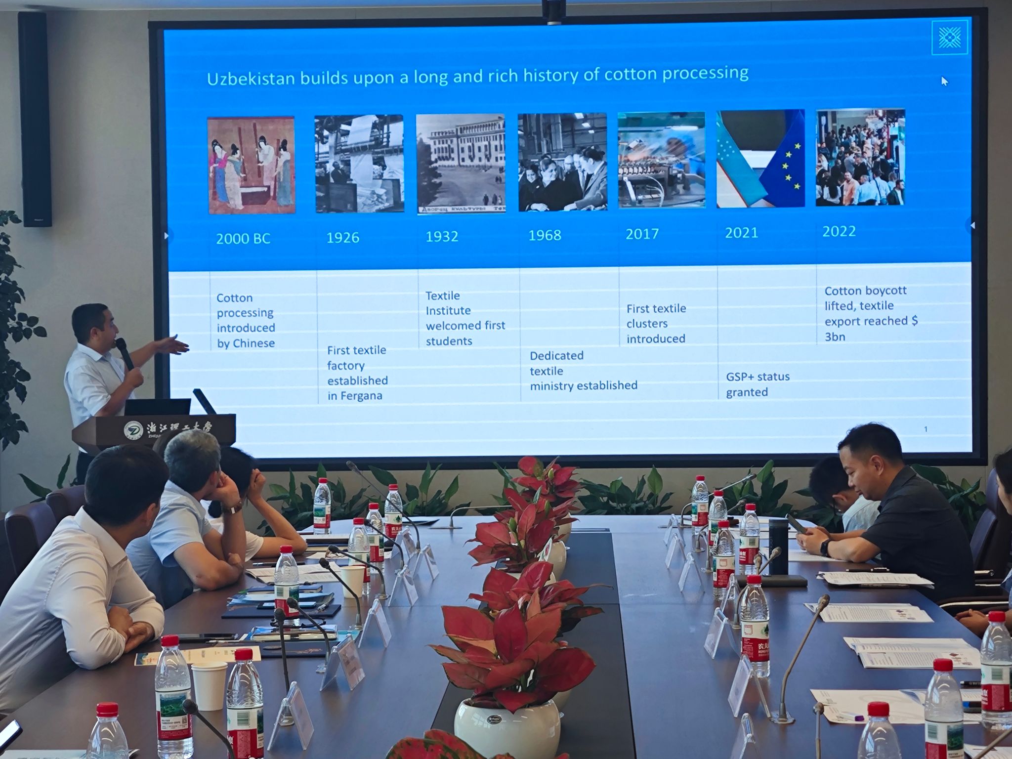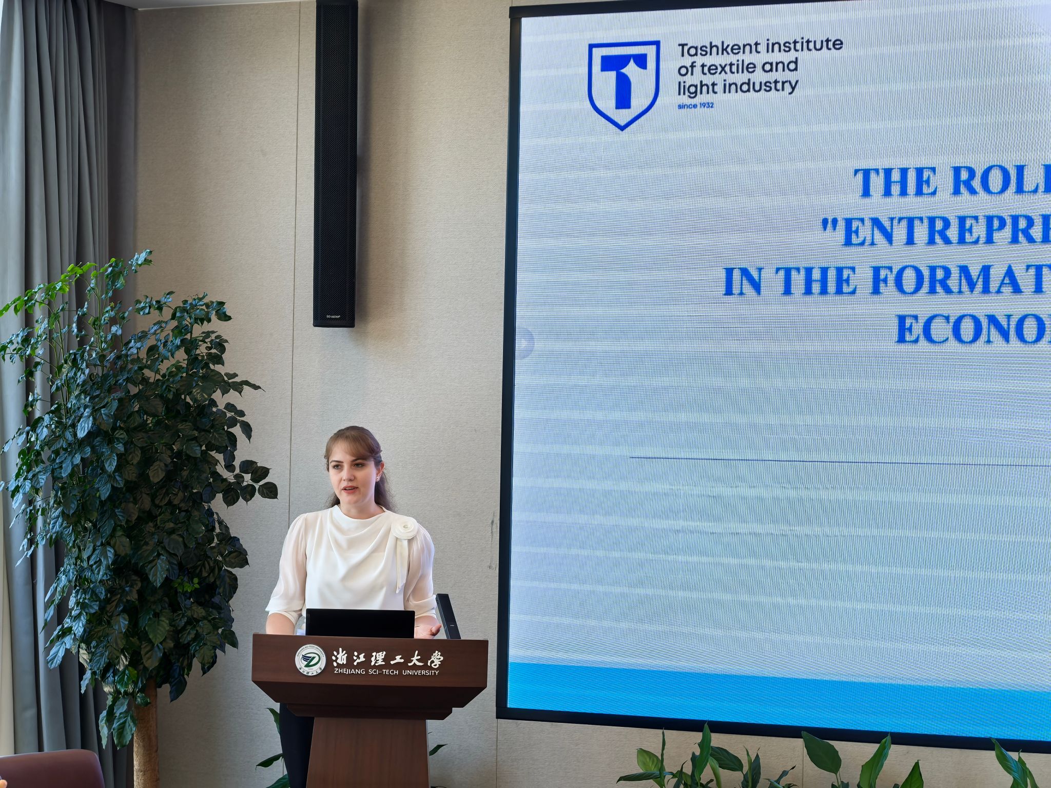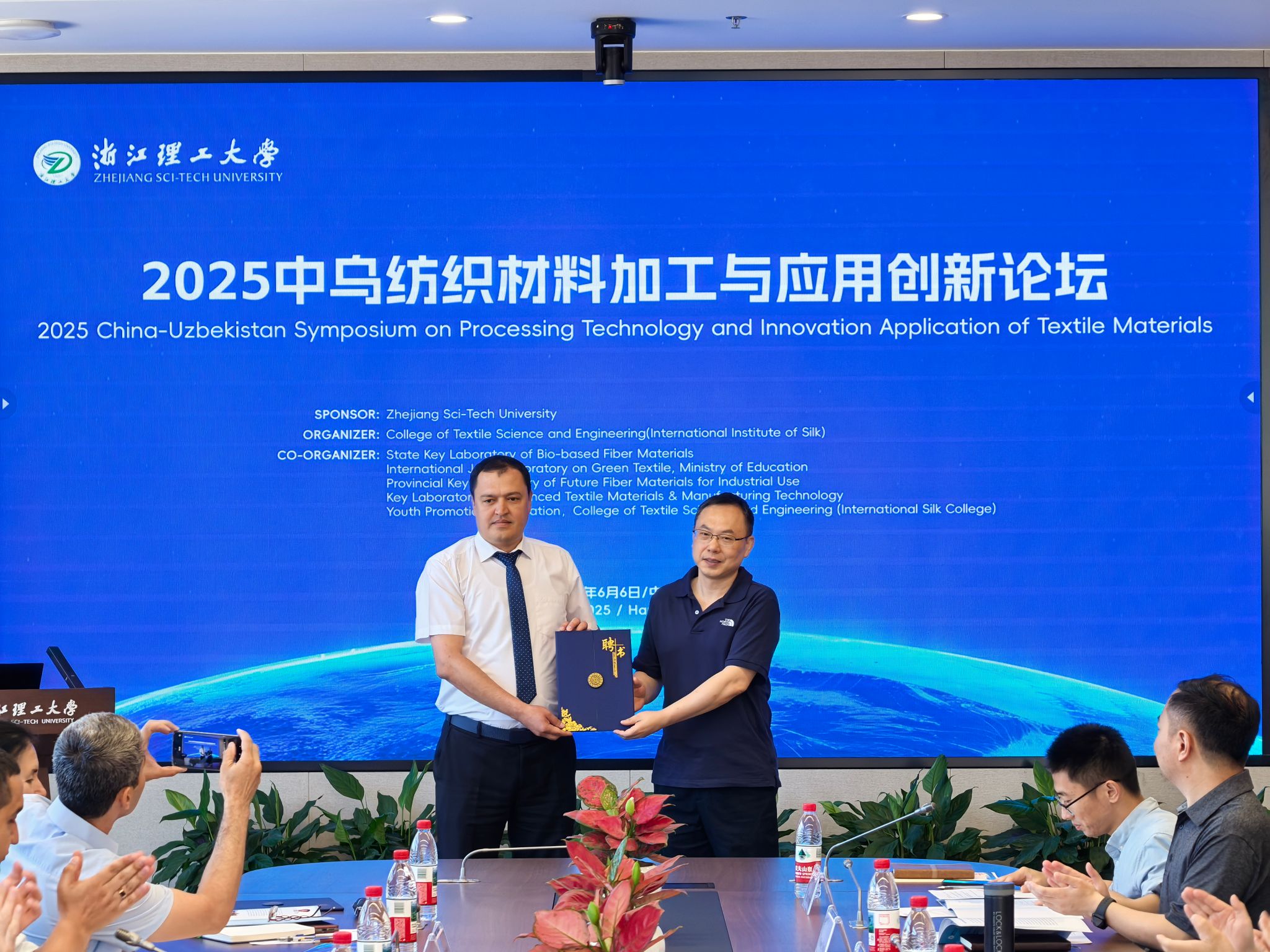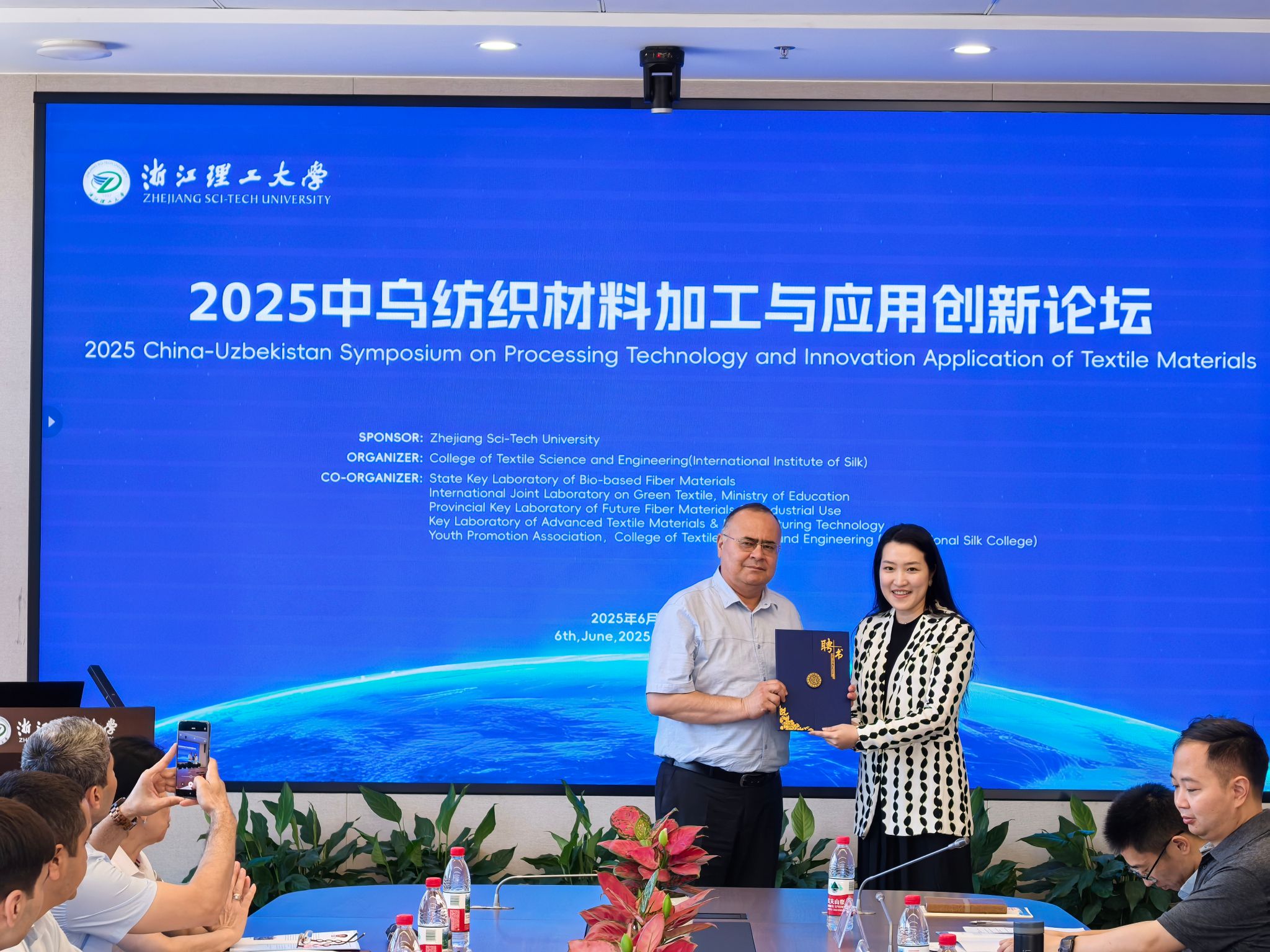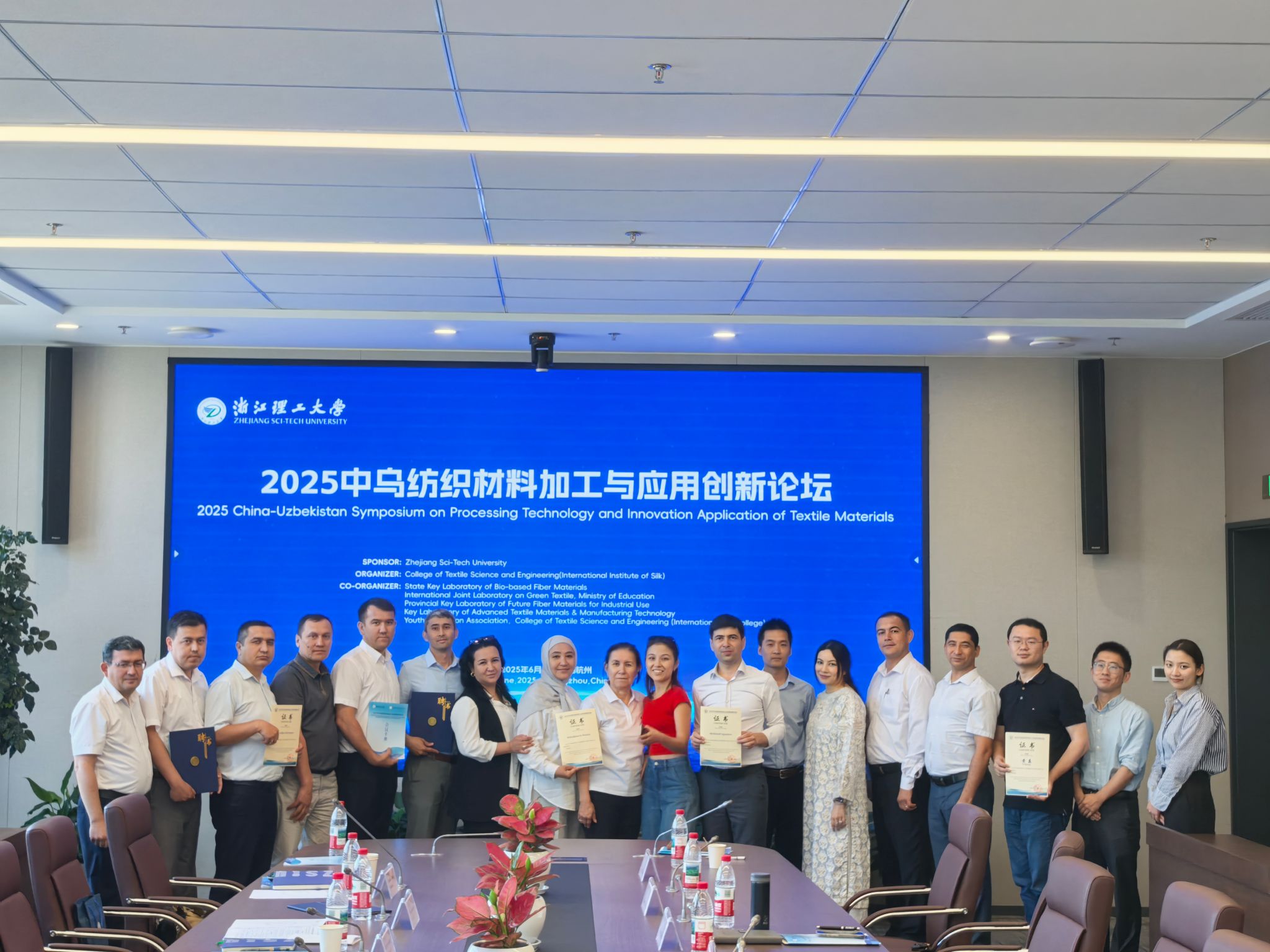 开幕式上,吕媛媛处长首先致辞,对参会的国内外学者表示感谢与欢迎,希望大家通过本次创新论坛,推动两校在纺织材料加工与应用领域的科技合作与人才交流。吕媛媛处长和于斌经理分别为塔什干纺织与轻工业公司4位教授颁发了导师证书。
