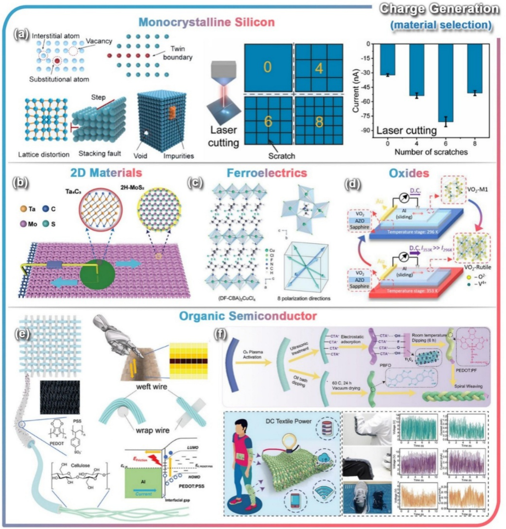 图3:材料选择策略以调控电荷产生。包括a)单晶硅,b)二维材料,c)铁电材料,d)氧化物,e,f)有机半导体。