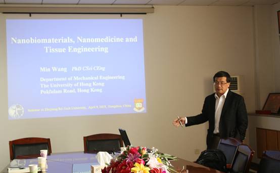 在简要介绍香港大学概况和校园文化之后,王敏教授详细阐述了所在课题组在纳米生物材料领域的主要研究成果及其在生物医药、组织工程等方面的应用。通过实例和研究结果,王敏教授向与会人员展示了纳米生物材料在人体组织修复、癌症探测和治疗、断骨固定等领域的应用前景,同时还探讨了影响非多孔生物活性复合材料的力学性能/生物医药功能的主要因素。王敏教授还介绍了所在课题组在传统静电纺丝技术基础上的新的研发方向。